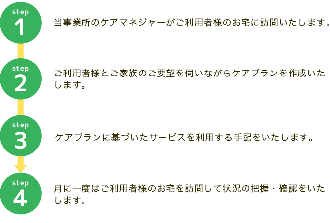 適切なサービスをご利用いただくために、ケアマネジャーはご利用者様及びご家族からのご相談に対応し、安心してより快適な在宅生活を継続していくために、状態やニーズを把握し、介護保険制度に基づいて希望に沿ったケアプランを作成します。